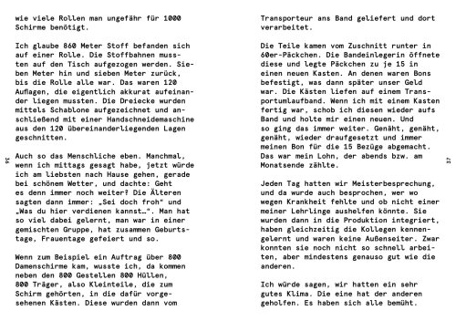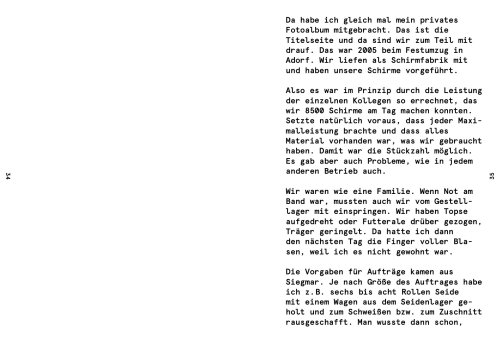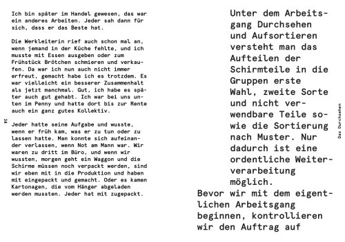 In Chemnitz und Umgebung begegnen Lysann Németh bis heute Einkaufsbeutel, die aus Stoffresten dieser Regenschirme gefertigt wurden. So entstanden die Fotoserien „Gefährten“ und „Auserwählte“. Zehn Textcollagen aus zahlreichen Gesprächen mit den ehemaligen Adorfer Arbeiterinnen erzählen von Schirmherstellung und Sonderschichten, Kollektiv und Arbeitsalltag, Endkontrolle – und Abwicklung.